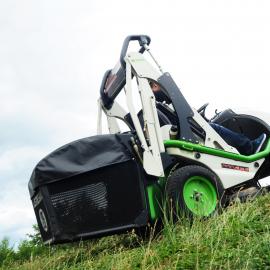 The Buffalo 100 ride-on mower is fitted with a built-in grass collector with a capacity of 600 litres, and the hydraulic emptying system is controlled from the driver's seat.